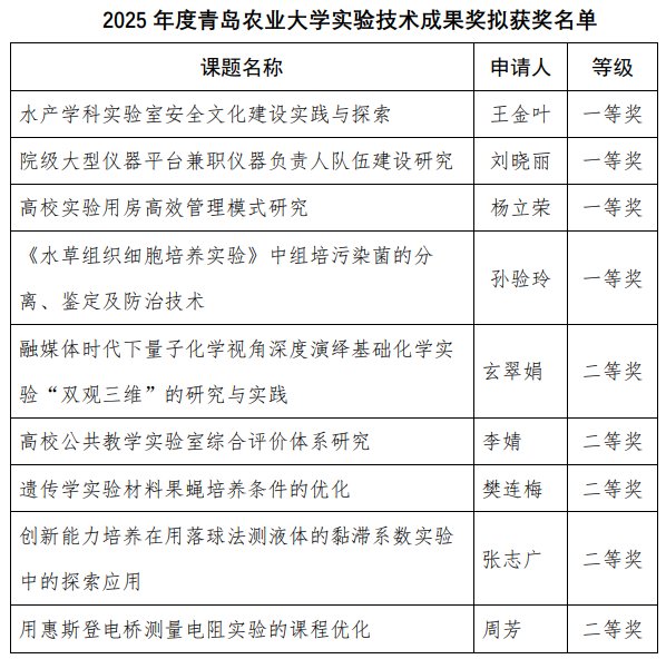根据《88858cc永利官网实验技术研究课题管理办法(修订)》(青农大校字〔2020〕133号)和《关于开展2025年度实验技术研究课题结题验收暨实验技术研究成果奖评选工作的通知》要求,学校组织了2025年度实验技术成果奖申报及评审工作,经个人申报、单位推荐和专家评审,拟确定以下9项实验技术成果奖,现将结果公示如下: